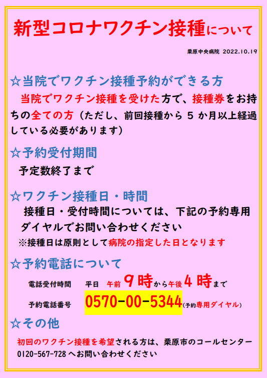 12月中の予防接種を希望される方は、栗原市のコールセンターにお問い合わせいただき、栗原市内の他の医療機関で接種を受けてくださるようお願いいたします。